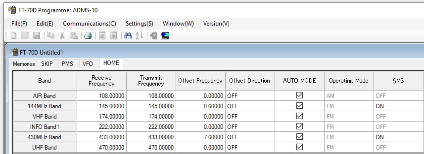 ![]() Yaesu offers a free download to program the FT-70D. It's called ADMS-10 and it a reasonable software package. I installed it and used it to (eventually) download the data from the HT. It has some interesting features, some like Chirp, some like RT Systems. Selecting the 'Home' tab alo offers a list of the bands the HT can receive, their function, and the operating mode.