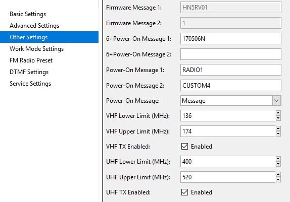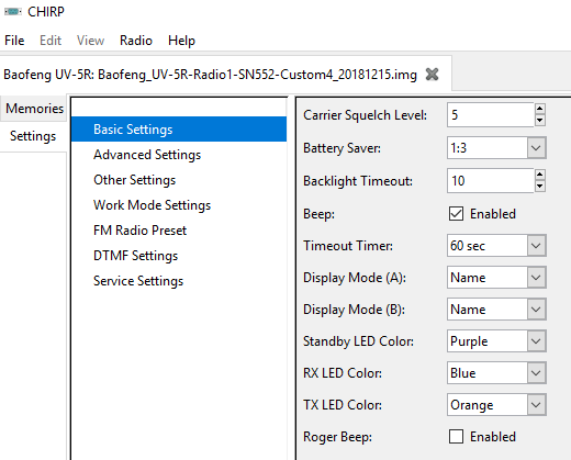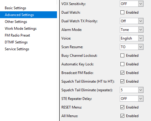 [(none)]: the frequencies are the same; [off] means transmissions on this channel are disabled (ie NOAA Weather channels); [split]: The offset column will contain the absolute transmit frequency to use for this repeater; [+]: the Offset column value will automatically be added to the Frequency column value when transmitting; [-]: the Offset column value will automatically be subtracted from the Frequency column value when transmitting. See What is a repeater and how/why do I use it below. Settings=>Basic Settings