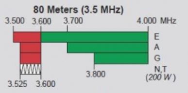 ![]() ![]() The smaller picture on the right is an enlarged section of the band map just covering the 80M band. There are some key things in the picture. 1.The green sections are phone (voice, in ham-speak) and image.2.The red areas are where RTTY and data are allowed. 3.The white background containing a sine wave defines the portion of the band where CW (Morse Code) is allowed. 4.The initials vertically arranged along the right side of the map show which rows describe which type of license; 'T' for Technician, 'G' for General, 'E' for Extra, and two legacy licenses, Novice and Advanced. 5.The more area in the row, the more of the band that type of license can access. The numbers are the frequencies (in MegaHertz for this example) at the extreme edge of the band limits. 6.The 200W means Novices and Technicians are only allowed to use 200 watts of transmit power. It may not seem like much, but that is potentially capable of very long range using CW. On a related note, amateurs are 'limited' to using 1500W on all bands except for certain specific limitations. These will be good to know on the exams. Not many limitations, but there are a few. Radio Bands and Frequency Assignments